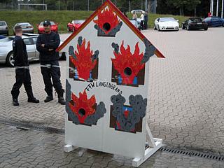 Leider begann es nach dem Essen, pünktlich zur Abfahrt, wie aus Eimern zu regnen. So war es notwendig, die Rückfahrt nach Schömberg zur Freiwilligen Feuerwehr etwas zu kürzen. Hier gab es "Spiel ohne Grenzen" einmal anders. Fahrer und Beifahrer wurden beim Löschen eines "Hauses" auf Geschick und Schnelligkeit getestet. Gewertet wurde die kürzeste Löschzeit und der effektivste Wasserverbrauch.