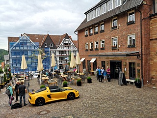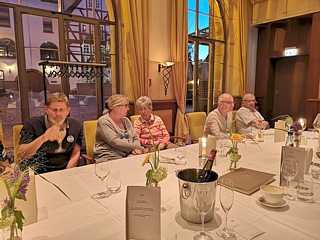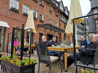 Der 6. Juni war unser Anreisetag. Es war ein Donnerstag, denn wir durften uns auf ein 4-Tages-Event freuen. Das Hotel liegt im Zentrum des schmucken Städtchens, direkt beim Rathaus mit seinen 10 Türmen – kein Schreibfehler. Das im Fachwerkstil erbaute Rathaus schmückt sich tatsächlich mit 10 Türmen. Am frühen Nachmittag ließen sich die ersten Gäste auf der Terrasse vor dem Hotel mit koffeinhaltigen Getränken und dazu passenden Süßspeisen verwöhnen, nachdem die Fahrzeuge in der für uns reservierten Hotelgarage sicher verwahrt wurden.
