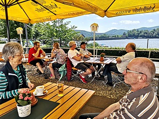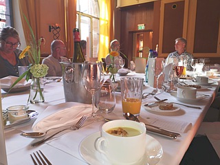Im Innenhof der Mühle waren Tische reserviert und wir ließen uns von der gutbürgerlichen Küche verwöhnen, als finstere Gewitterwolken den Himmel verdunkelten. Alsbald trommelten dicke Regentropfen auf die Sonnenschirme. Glücklicherweise konnten wir in den behaglich eingerichteten Gastraum der Mühle flüchten. Am späteren Abend zogen es die meisten Teilnehmer vor, sich vom Taxi ins Hotel chauffieren zu lassen. Nur die ganz Harten nahmen wieder den Fußweg. An der gut sortierten Hotelbar ließen wir den Tag ausklingen.
