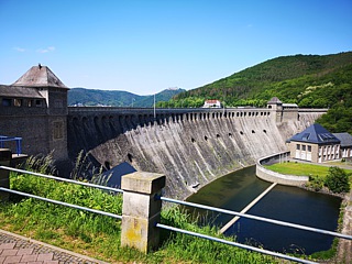 Den weiteren Tagesverlauf konnte jede Fahrzeugbesatzung selbst bestimmen. Ein Grüppchen beschloss zum Edersee in Richtung Staumauer zu fahren. Unterwegs legten wir eine Kaffeepause im Terrassenhotel ein. Das Haus liegt direkt am Seeufer und versprüht den Charme der sechziger Jahre und das Personal fügte sich wunderbar in dieses Bild ein. Als wir auf der Terrasse mit Blick zum See auf unsere Bestellung warteten, meinte einer von uns, ein Windbeutel wäre jetzt genau das Richtige. Diese Süßspeise stand aber leider nicht auf der Speisekarte. Ein anderer meinte zu wissen, dass es ganz in der Nähe die besten und größten Windbeutel aller Zeiten gäbe. Es wurde kurz „gegoogelt“ und ein Teil der Gruppe (ich werde keine Namen nennen) konnte der Versuchung nicht widerstehen. Der andere Teil beschloss die Staumauer zu inspizieren.