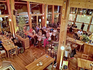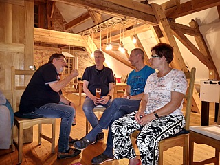 Wieder zurück im Hotel, ließen wir den ersten gemeinsamen Abend im sogenannten „Wohnzimmer“ ausklingen. Der rustikal ausgestattete Raum unterm Dach wird zwar nicht bewirtet, aber die Gäste können sich am gut befüllten Kühlschrank selbst bedienen und ihren Verzehr unbürokratisch auf einer Strichliste notieren.