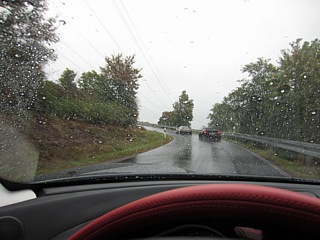Der folgende Morgen – es war der Freitag – empfing uns mit Dauerregen. Da war bereits beim Frühstückstisch klar: Die Traktionskontrolle oder wahlweise das „Popometer“ werden während der Ausfahrt zur Wasserkuppe viel Arbeit haben. Per „Calimoto“ bahnten wir uns den Weg hinauf zur Wasserkuppe. Dort oben war es neblig, kalt, stürmisch und der Regen kam horizontal aus Nord-Ost. Kein guter Zeitpunkt um aus dem Auto auszusteigen.
