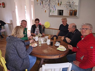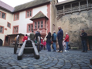 Während der Rückfahrt zum Hotel mussten wir – ebenso wie am Vormittag – keinerlei Bedenken haben, dass unsere Fahrzeuge staubig werden könnten. Es regnete nämlich immer noch. Erst am späten Nachmittag hatte Petrus ein Einsehen, so dass unsere Fahrt zur „Ronneburg“ etwas angenehmer verlief. Gegen 18:00 Uhr öffneten sich die schweren Tore der Burg für uns und während der folgenden Führung lernten wir viel über das frühere Leben auf solch einer Festung. Im Burgrestaurant wurde derweil eine lange Tafel für uns vorbereitet. Dort schlemmten wir anschließend bis in den späten Abend.