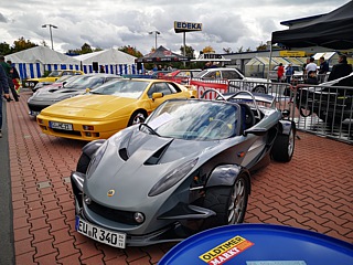 Der Zufall wollte es, dass zeitgleich mit unserer Ausfahrt in Wölfersheim-Berstadt die „Classic-Days“ stattfanden. Unsere Clubmitglieder Carmen und Michael Berndt stellten dort ohnehin einige Lotus- Derivate aus. Was lag also näher, als das Ausstellungsgelände mit einigen weiteren Lotus-Fahrzeugen zu bereichern. Die Veranstalter empfingen uns freundlich und dirigierten unsere Truppe auf den abgesperrten Bereich. Jedes Team bekam bei der Einfahrt ein kleines Giveaway. Etwas später gab es bei der angrenzenden Bäckerei obendrein auch noch eine Tasse Kaffee for free.