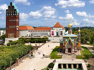 Der Samstag: Die Mathildenhöhe am Rand der Darmstädter Innenstadt ist seit kurzem Weltkulturerbe. Kein Wunder also, dass dieses architektonische Kleinod von uns besucht werden musste. Als wir dort eintrafen, wartete vor dem Hochzeitsturm gerade eine Hochzeitsgesellschaft auf das Brautpaar. Der Hochzeitsturm ist ein beliebter und stark frequentierter Ort, um sich dort das Ja-Wort zu geben. Pech für uns, denn wir konnten deshalb den Turm nicht besichtigen.