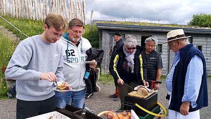 Hier hatte der Mühlen-Patron ein schnuckeliges Picknick mit netten Geschichten über die ehemaligen Schanzen in Gersbach parat. In humorvoller Weise erzählte er Dies und Das über das Gelände und den niedlichen Ort samt seiner Bewohner. Und wenn er so ins Plaudern kommt ... Nun denn, essen wir halt etwas später zu Abend.