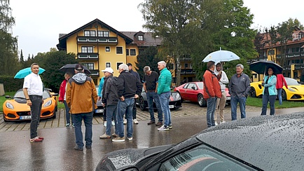 Samstag, 23. September: Im Roadbook war zu lesen: „Nach einem ausgiebigen Frühstück lassen wir es heute etwas entspannter angehen.“ – Das Wetter war kaum besser, als am Vortag. Dennoch genossen wir insgesamt 180 Kilometer auf einer der schönsten Strecken im Umkreis. Unter anderem legten wir am Sylvensteinspeicher einen Zwischenstopp ein. Wir reihten unsere Fahrzeuge auf der Staumauer auf. Petrus hatte ein Einsehen und stoppte die Wasserzufuhr von oben, zumindest solange, bis wir wieder in die Autos einstiegen.