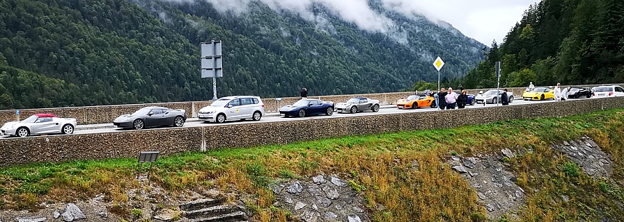Zum Glück hatte Thomas noch zwei weitere „Pfeile im Köcher“. Fast alle entschieden sich für die zweite Option. Auch diese Route führte über schöne Bergstraßen. Anders als bei den Bayern-Events der vergangenen Jahre, musste unser Kurdirektor an diesem Wochenende keinen beruflichen Pflichten nachkommen und hatte somit die Gelegenheit, selbst mit seinem geliebten Lotus die Tour mitzufahren. Also legte er gemeinsam mit Sabine, seiner besseren Hälfte, als Sozius die Spur und der Rest folgte ihm. Die bekannte, rund 16 Kilometer lange Tatzelwurmstraße gehörte auch zu unserer Route.