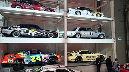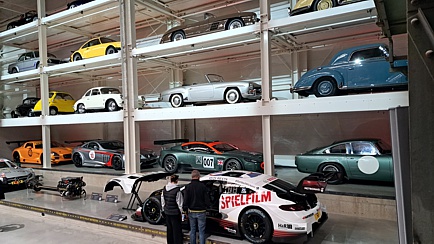 Nachdem man sich gegenseitig begrüßt hatte, konnte jeder nach Lust und Laune das Museum erkunden. Es würde den Rahmen dieses Berichts sprengen, auch nur ansatzweise beschreiben zu wollen, was der Besucher dort zu sehen bekommt. Alleine der sogenannte „Setzkasten“ an der Stirnwand der großen Halle ist atemberaubend und das nicht nur wegen der dort gestapelten Fahrzeuge. Der Clou an der Sache ist, dass man quasi auf Knopfdruck jedes beliebige Vehikel innerhalb kürzester Zeit an die Ausfahrt-Position bugsieren kann. Hierbei werden ggf. mehrere Autos, ähnlich wie beim Tetris-Spiel, in der Hoch- und Längsachse verschoben, bis sich der gewünschte Bolide an der vorgegebenen Position befindet.