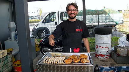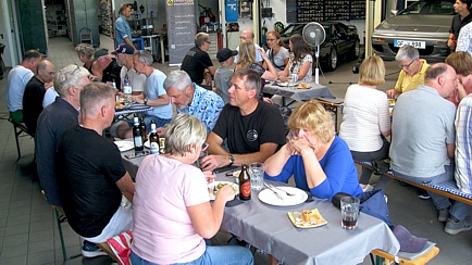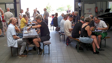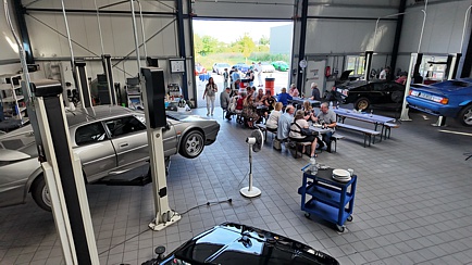 In der großen Halle standen Tische und Bänke bereit. Auch dort hatten die Gäste einen Ausblick auf diverse Lotus-Fahrzeuge, welche fotogen auf den Hebebühnen präsentiert wurden. Natürlich waren auch Nichtmitglieder herzlich willkommen, diese mussten aber einen symbolischen Unkostenbeitrag für die Verpflegung entrichten.