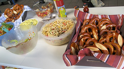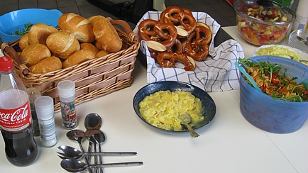 Der Grill wurde angefeuert und von den Grillmeistern wurden gekonnt verschiedene Steaks und Bratwürste zubereitet. Zum Grillgut gab es Brötchen und Brezeln. Salate und passende Dressings durften nicht fehlen. Diese – und übrigens auch der Kuchen für den Nachmittags-Café - wurden zum Teil von Clubmitgliedern mitgebracht. Neben Bier und Radler standen auch verschiedene nichtalkoholische Getränke zur Verfügung.