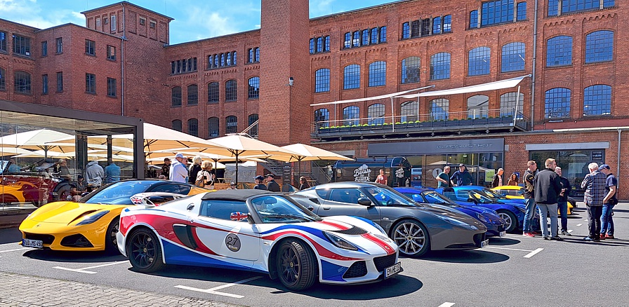 Unser Treffen begann um 10:00 Uhr. Nach und nach trafen Clubmitglieder und Gäste mit ihren Fahrzeugen im Innenhof der Klassikstadt ein. Auf dem Parkplatz direkt vor dem Restaurant „Werkskantine“ war alsbald eine bunte Mischung verschiedener Lotus-Modelle zu bestaunen. Praktischerweise hatten wir in der Werkskantine fürs Mittagessen Plätze reserviert.