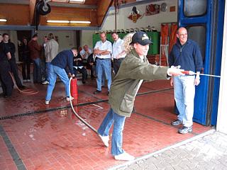 Leider begann es nach dem Essen, pünktlich zur Abfahrt, wie aus Eimern zu regnen. So war es notwendig, die Rückfahrt nach Schömberg zur Freiwilligen Feuerwehr etwas zu kürzen. Hier gab es "Spiel ohne Grenzen" einmal anders. Fahrer und Beifahrer wurden beim Löschen eines "Hauses" auf Geschick und Schnelligkeit getestet. Gewertet wurde die kürzeste Löschzeit und der effektivste Wasserverbrauch.