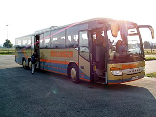 Gegen 19:00 Uhr wartete der Shuttle-Bus für die Fahrt zur Schloßbrauerei Maxlrain. Da für den späteren Abend eine Unwetterwarnung bestand und das B&O Parkhotel auf einem ehemaligen Militärgelände einer großen Abhörbasis des US-amerikanischen Geheimdienstes NSA lag, konnten die Fahrzeuge in einem Hangar sicher untergestellt werden.