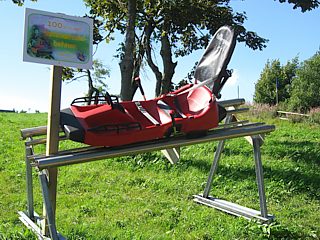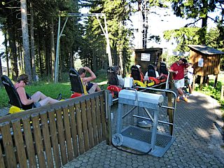 Man hätte sich noch stundenlang im Museum aufhalten können, aber die Wasserkuppe hat noch mehr zu bieten. Die sportlichen und waghalsigen testeten die Sommerrodelbahn. Eine andere Gruppe zog es vor, das Radom zu besuchen. Die Wasserkuppe ist mit 950 Metern der höchste Berg in Hessen. Nach dem zweiten Weltkrieg wurde auf dem Gipfel zur Luftraumüberwachung eine Radarstation, das Radom, errichtet. Nach der deutschen Wiedervereinigung hat die Bundes-Luftwaffe den Standort verlassen. Die Radarkuppel findet heute Verwendung als Aussichtsturm und Veranstaltungsort. Von der Ferne sieht dieses Bauwerk aus wie ein überdimensionaler Fußball. Dort angekommen, gelangt man durch Einwurf kleiner Münzen über eine eiserne Drehtür auf die Aussichtsplattform, die das untere Drittel der Kugel umschließt. Von dort aus eröffnet sich ein herrlicher Blick über die Hügellandschaft.