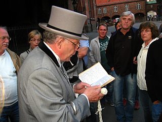 Gegen 20:30 Uhr wurden die Teilnehmer von Konsul Buddenbrock erwartet. Er führte sie dann durch die Altstadt Lübecks, ein Weltkulturerbe der Menschheit. Herr Buddenbrock erzählte in kurzweiliger Form viel Wissenswertes über die Hansestadt und führte die Gruppe durch wunderschöne Gassen und Gässchen. Langsam wurde es Nacht in Lübeck und die Fotografen hatten ihre liebe Mühe die Motive richtig auszuleuchten.