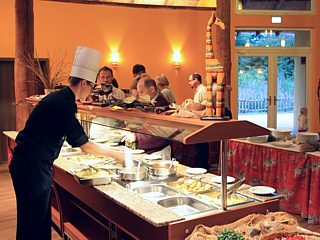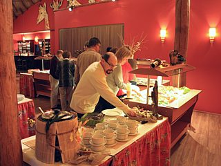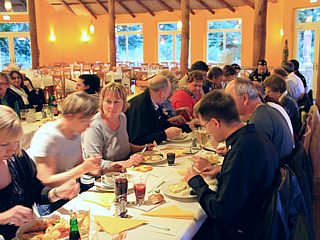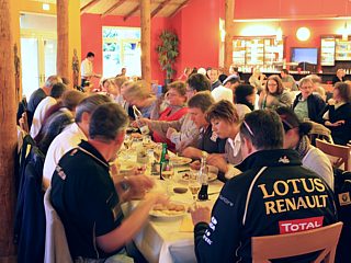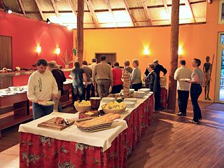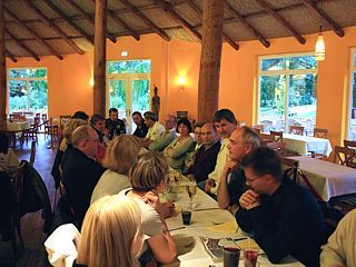 Nach diesen ersten Eindrücken stand gegen 19:00 Uhr das gemeinsame Abendessen auf dem Programm. Hierfür waren im Restaurant "Savanne-Lodge" Tische reserviert. Bevor man zum kulinarischen Teil überging, erfolgte jedoch die offizielle Begrüßung und die Ausgabe der Roadbooks sowie ein Abriss des in den nächsten drei Tagen zu erwartenden Programms.