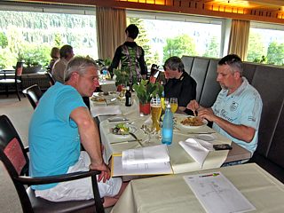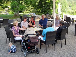 In Anbetracht der hochsommerlichen Temperaturen verbrachte man die Zeit bis zum Abendessen auf der sonnigen Seeterrasse des Restaurants. Hier erfolgte auch die Ausgabe des Programms und der Roadbooks.