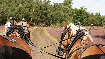 Auf einem eigenen Weg für die Kutschen ging es vorbei an Radfahrern und Wanderern quer durch die Lüneburger Heide. Vom Kutscher erfuhr man viel Wissenswertes. So zum Beispiel das die ganzen Birken nur "Unkraut" in der Heide sind, und neu aufgegangene mit Aktionen von Schulklassen entfernt werden. Oder das die Heide gepflegt wird indem sie alle paar Jahre tief abgemäht oder auch abgebrannt wird. Und so verging die Fahrt dann doch recht kurzweilig.