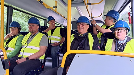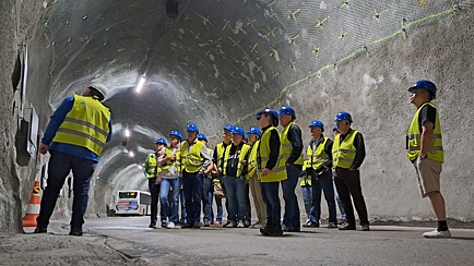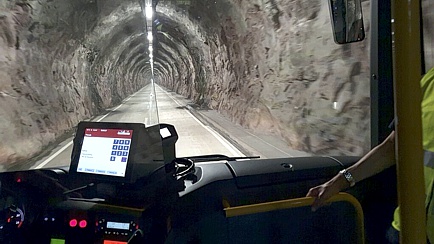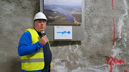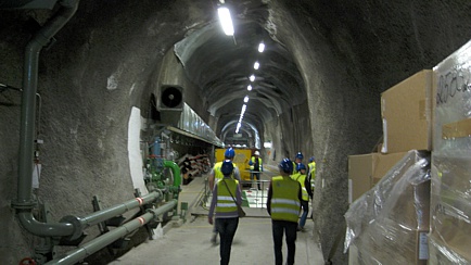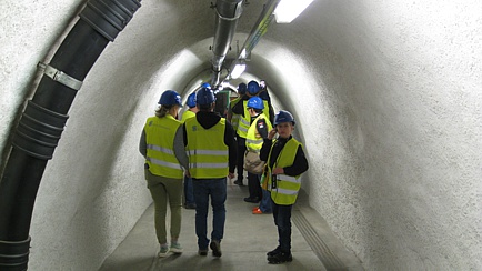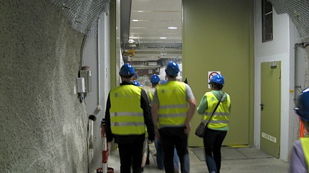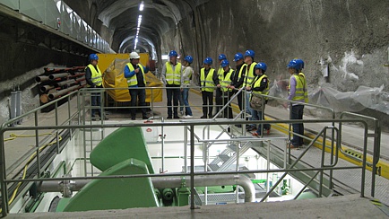 Ausgestattet mit Helm, Warnweste und Akustiksystem konnte nun die eigentliche Besichtigung beginnen. Mit einem Bus erfolgte die Zufahrt über einen 1.5km langen Stollen zur Kraftwerkskaverne. Hier angekommen gab es von unserem Gästeführer nochmals Informationen, diesmal aber speziell zu der Kraftwerks- und Schieberkaverne.