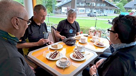 Im Anschluß stand nun die fünfte Etappe und somit die Rückfahrt zum Landhotel "Mühle zu Gersbach" auf dem Programm. Diese gestaltete sich eher individuell. Die einen fuhren zielstrebig zum Hotel, um dort noch ein wenig vor dem Abendessen zu entspannen. Die anderen genossen noch weiterhin ihren Nachmittagscafé. Oder um für den nächsten Tag vorbereitet zu sein, legten einige Teilnehmer noch einen Tank- und Servicestop ein.