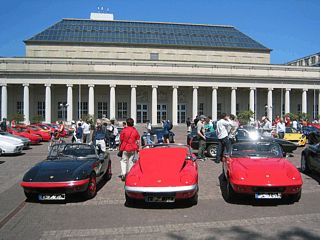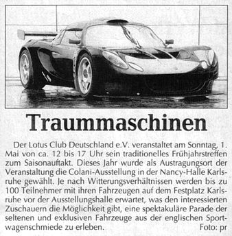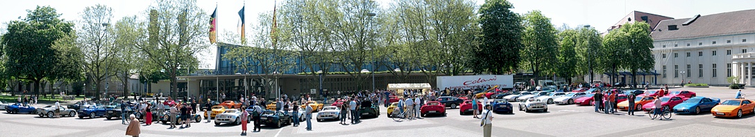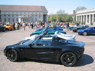Bei hochsommerlichen Temperaturen um die 28° C war der Lotus Club Deutschland ab 12:00 Uhr mit seinem Stand auf dem Festplatz vor dem Kongresszentrum präsent. Eingerahmt von Stadt-, Schwarzwald-, Nancyhalle und dem Konzerthaus durften hier exclusiv alle mit einem Lotus-Fahrzeug anreisenden Besucher parken. Zahlreiche Clubmitglieder und Lotus-Enthusiasten folgten den Einladungen sowie dem Aufruf in der Presse und dem Internet.