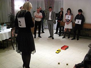 Nun näherte sich der Abend seinem Höhepunkt, der Tombola. In der ersten Ausscheidungsrunde wurde die Losnummerngruppe ausgespielt. Hierbei mußten die vier ausgewählten Teilnehmerinnen mit einem ferngesteuerten Lotus Esprit - Modell schnellst möglich einen Parcour durchfahren und rückwärts in die "Box" einparken.