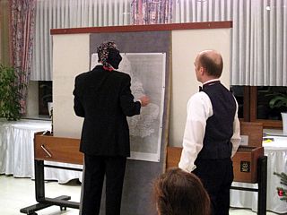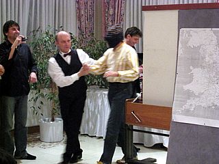 Die nun verbliebenen Teilnehmer mit den Losen der Nummern- und Typengruppe spielten jetzt um den Gewinn. Hierzu mußten sie mit verbundenen Augen auf einer Landkarte von England das Lotus-Werk in Hethel mit einem Pin markieren. Der Pin, der dem Ziel am nächsten lag, gewann: Sieger wurde unser österreichisches Clubmitglied Dragan Ogric!