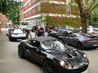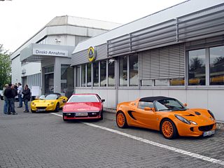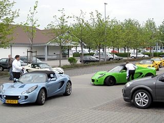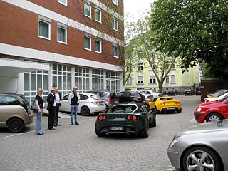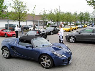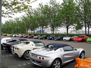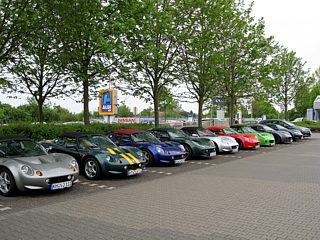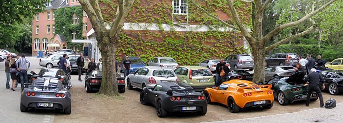 Obwohl das Wetter durchwachsen war und die Meteorologen noch schlimmeres prognostizierten, füllte sich bereits am Vormittag der große Parkplatz mit Lotusfahrzeugen. Die KFZ-Kennzeichen verrieten, dass sich die Lotusfahrer auch von weiten Anreisewegen nicht abschrecken ließen. So zum Beispiel von der Schweizer Grenze ganz im Süden Deutschlands wie auch von der Nordsee.