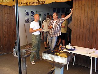 Gegen 17:00 Uhr feuerte der LCD-Grillmeister die Holzkohlengrills an und bot diverse routiniert zubereitete Bratwürste, Fleischspieße sowie Steaks für die mittlerweile hungrigen Clubmitglieder. Dazu wurde frisch gezapftes Bier vom Faß und nichtalkoholische Getränke angeboten. Zu fortgeschrittener Stunde gab es natürlich auch die obligatorischen Kaltschalen.