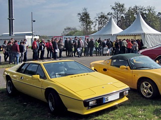 Nach der Fahrzeugregistrierung fuhr man zur Mercedestribüne. Erfreulicherweise ist dort mittlerweile im Gegensatz zu früher das ganze Areal großflächig asphaltiert. Dort parkten die Markenclubs. Freundliche Marshalls sorgten dafür, dass die Fahrzeuge in Gruppen geordnet aufgereiht wurden. Für Lotus war der größte Bereich reserviert. Inmitten dieser vielen Exoten aus Großbritannien errichtete unser 3. Vorsitzender, Kai-Uwe Abel, mit einigen fleißigen Helfern, einen kleinen Pavillon. Die LCD-Beachflag war weithin sichtbar, so dass der mit Club-Accessoires ausgestatte Pavillon von den Clubmitgliedern gerne als Treffpunkt genutzt wurde. Am Club interessierte Nichtmitglieder konnten sich dort unverbindlich informieren und einen ersten Eindruck vom Lotus Club Deutschland gewinnen.