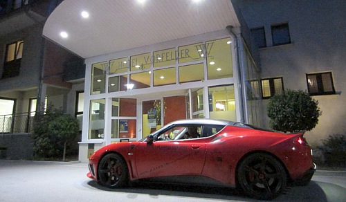 Der Rekordversuch stand am Samstag, den 12. April um 19:00 Uhr als letzter Programmpunkt auf dem Zeitplan. Es war also vorhersehbar, dass es für die Teilnehmer ein langer Tag werden würde, und wer nicht gerade in der Umgebung von Hockenheim wohnt, der war gut beraten, sich ein Hotelzimmer zu nehmen. Der Lotus-Club-Deutschland war im Hotel Vorfelder in Walldorf untergebracht, ebenso wie die Jungs vom Historic-Register-Germany. Aufgrund der Tatsache, dass nach dem Rekordversuch alle Teilnehmer mehr oder weniger gleichzeitig und ziemlich spät abends beim Hotel ankamen, waren einige logistische Vorbereitungen zu treffen. Die kompetenten und überaus freundlichen und hilfsbereiten Mitarbeiter des Hotels unterstützen uns dabei nach Kräften. So wurden beispielsweise wunschgemäß speziell für die Lotusfahrer auf dem Hotelgelände Parkplätze reserviert und ausgeschildert.