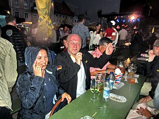 Apropos Organisationstalent: Bei der Oldie Night ist ganz Bad Aiblig auf den Beinen und der Innenstadtbereich gleicht einem großen Freiluftmuseum, denn die Fahrzeuge der Rallye-Teilnehmer sind dort geparkt. Es ist nicht üblich und eigentlich unmöglich, einige der begehrten Sitzplätze auf der Festmeile zu reservieren. Aber Thomas Jahn machte das Unmögliche möglich und reservierte exklusiv für den Lotus- Club Tische und Bänke. Die Life-Band „Wirtschaftswunder“ heizte mächtig ein, so dass wir das herannahende Unwetter ignorierten. Erst als es anfing zu regnen suchten die Wasserscheuen ein trockenes Plätzchen. Der Rest feierte unbeeindruckt weiter. Später brachte uns der Bus-Shuttle zurück ins Hotel, wo die Campus Bar wieder auf uns wartete.