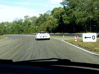 Die ersten 10 Minuten in jedem Lauf fühlte ich mich schon etwas als Sonntagsfahrer, rechts und links pfeifen die anderen vorbei und die Blaue Flagge wird gewedelt, aber dann lichtet sich das Feld, und immer weniger Fahrer sind auf der Strecke. Jetzt kann ich richtig probieren. Welcher Gang für welche Kurve. Wo genau bremsen. Es braucht schon gute Nerven, wenn man nach der langen Geraden mit 200 auf die leichte Rechtskurve zufährt die etwa 140 km/h verträgt, danach voll in die Eisen, 90 Grad Rechtskurve 3. Gang, raus beschleunigen, Spiegelcheck, Reifen bis an die Curbs, Linkskurve, 3. Gang ausdrehen, 4. Gang, scharfe 180 Grad Linkskurve im 2. Gang, ... alles Konzentrationssache. Mit jedem Lauf ging es besser. Meine Beste Runde verbesserte sich im Lauf des Tages von 2:02 auf 1:55 beim letzten Wertungslauf. Ich habe gelernt, wie sich der Wagen verhält, wenn er den Limits näherkommt. Zum Beispiel bricht er bei langen schnellen Kurven hinten nicht aus oder untersteuert, wie das bei kalten Reifen auf der Landstraße der Fall ist, sondern fängt an zu rubbeln bleibt aber total stabil. Ferner sollte man gleich tanken, wenn die gelbe Tankleuchte aufleuchtet, denn kurz danach hat in einer langen links Kurve beim rausbeschleunigen der Motor ausgesetzt. Macht nichts weiter etwas langsamer und in die Boxengasse zum Tanken.
