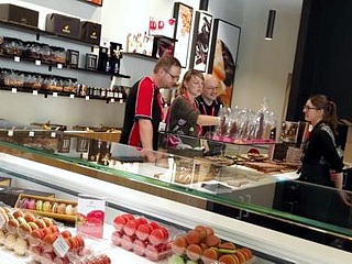 Fußläufig erreichbar in 1,5 - 2 Minuten. Obendrein gibts noch einen Museumsbesuch (mit Verkostung ), den man mit seinem "Badge" lösen kann. Mit muttersprachlicher Erklärung mittels elektronischem Hilfsmittel schreitet man durch die Szenen. Zu der interessanten Historie der Entwicklung von der Kakaobohne bis zum Praline gibt es reichlich Wissenswertes zur Herstellung. Auch gab es die Aufgabe verschiedenste Aromen zu erkennen. Unterwegs gibt´s dann quasi Genuss auf Anweisung der am Eingang mitgegebenen "Schoko-Muster". Schlussendlich der Blick in die Produktion, wo Schokolade in Strömen aus den überdimensionalen Hähnen läuft. Mein Urteil: für Süßmäuler der Weg ins Paradies - und dann noch die süßen Verlockungen in den Vitrinen in Richtung Ausgang, welcher "glücklicherweise" auch noch von einer Cafeteria umsäumt wird... Weitere Umschreibungen erübrigen sich an dieser Stelle selbstredend.
