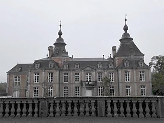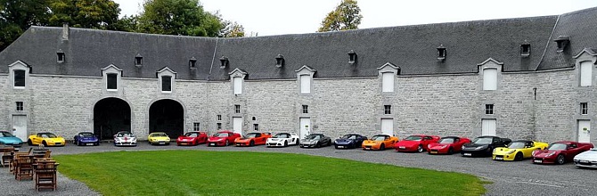 Am folgenden Morgen, dem Abreistag, hat das Wetter ein Einsehen und belohnt uns wieder mit blauem Himmel / Sonnenschein. Die angeratene Tour, die wie am Vortag auch, per GPX-Daten im Navi dem Beifahrer das Kartenlesen erspart / erleichtert, führt erneut durch die markante und vielfältige Ardennenlandschaft mit dem letzten Ziel des Events - das Chateau de Harzé. Die sorgfältige Aufreihung der Fahrzeuge unter Rudy´s strenger Anleitung ergibt ein erfreuliches Ensemble in Verbindung mit der Schlossanlage. Man könnte die liebe lange Zeit auf einer Parkbank - oder auf dem Rand des Springbrunnens - sitzen und die Blicke schweifen lassen. Das sind Eindrücke, die lange bleiben.