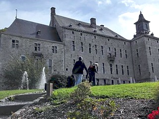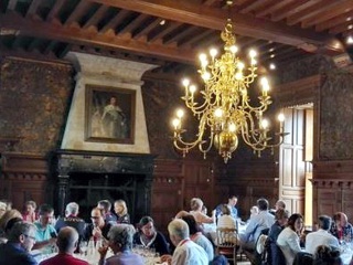 Nur noch wenige Km trennen uns von unserem nächsten Programmpunkt: Anfahrt Château de Modave. Wer rechtzeitig kommt, und beim Lunchbuffet mit lokalen Köstlichkeiten sich nicht übergebührend lange aufhält, hat noch Zeit für eine Schlossbesichtigung. Das im Mittelalter erbaute Schloss beeindruckt durch seine Stuckverzierungen, vertäfelte bzw. mit Wandteppichen verzierten Wände. Große Gemälde runden das Bild ab. In einem offenen Jagdbuch, welches dort auslag, äußert sich der Schreiber in einer Randnotiz über das Wetter: sch... Wetter heute. Aha, also schon damals....