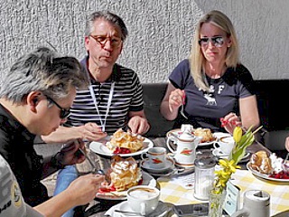 Das Roadbook führte uns über winkelige fränkische Sträßchen zu unserm ersten Zwischenstopp. Auf der Terrasse des Windbeutel-Cafés in Hohenstein hatten wir bei schönstem Sonnenschein einen sagenhaften Blick auf die Burg Hohenstein. Das nächste Zwischenziel war zu diesem Zeitpunkt noch geheim, denn es sollte eine Überraschung werden.