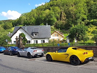 Die Tour, inclusive Mittagspause, organisierte natürlich Schwarzwaldkenner Uwe Zerrweck. Bei besagter Mittagspause in Dornstetten gesellte sich noch Hartmut Lindloff zu uns und unsere Anreisetruppe war ab hier komplett. Mit nunmehr sechs Lotus ging es zeitweise gemächlich und mal recht zügig über zumeist kurvige Sträßchen Richtung Süden. Nach einer weiteren (Kaffee-) Pause erreichten wir gut gelaunt das Hotel Adler in Endingen.