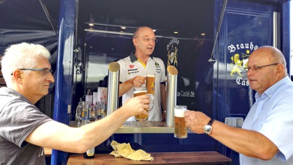 Auch ein weiteres Highlight hatte dieses Jahr Premiere. Die allseits bekannte Getränketheke im Clubheim wurde Geschichte. Stattdessen wurde ein Getränkewagen mit Kühlgelegenheit und Zapfanlage organisiert. An dieses Schmuckstück hatte ganz besonders unser Ehrenvorsitzender sein Herz verloren. Es wurden auch seitens der Clubmitglieder Stimmen laut doch so etwas für den Club anzuschaffen, aber natürlich bitte in British Racing Green und mit dem Lotus-Club Logo.