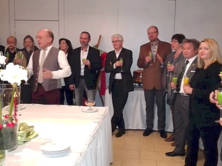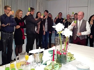 In den letzten Jahren hatten wir oft so viel Programm, dass der offizielle Teil der Feierlichkeiten erst am frühen Morgen des folgenden Tages beendet war. Diesmal gab es einige Änderungen im Vergleich zu den Vorjahren, welche nach meiner Einschätzung bei den Anwesenden auch sehr gut ankamen. Es begann bereits mit der Bestuhlung des festlich geschmückten Raums. Bisher hatten wir mehrere Runde Tische im Saal verteilt, so dass sich unweigerlich kleine Grüppchen bildeten. Diesmal saßen wir alle an einer langen Tafel. Natürlich hatten Hugo und Ellen wieder liebevoll gestaltete Platzkärtchen vorbereitet und wie immer, fand auch jeder Gast ein kleines Geschenk an seinem Sitzplatz vor.