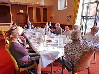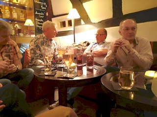 Im Innenhof der Mühle waren Tische reserviert und wir ließen uns von der gutbürgerlichen Küche verwöhnen, als finstere Gewitterwolken den Himmel verdunkelten. Alsbald trommelten dicke Regentropfen auf die Sonnenschirme. Glücklicherweise konnten wir in den behaglich eingerichteten Gastraum der Mühle flüchten. Am späteren Abend zogen es die meisten Teilnehmer vor, sich vom Taxi ins Hotel chauffieren zu lassen. Nur die ganz Harten nahmen wieder den Fußweg. An der gut sortierten Hotelbar ließen wir den Tag ausklingen.