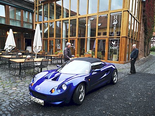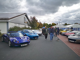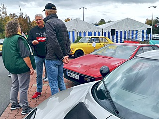 Der Zufall wollte es, dass zeitgleich mit unserer Ausfahrt in Wölfersheim-Berstadt die „Classic-Days“ stattfanden. Unsere Clubmitglieder Carmen und Michael Berndt stellten dort ohnehin einige Lotus- Derivate aus. Was lag also näher, als das Ausstellungsgelände mit einigen weiteren Lotus-Fahrzeugen zu bereichern. Die Veranstalter empfingen uns freundlich und dirigierten unsere Truppe auf den abgesperrten Bereich. Jedes Team bekam bei der Einfahrt ein kleines Giveaway. Etwas später gab es bei der angrenzenden Bäckerei obendrein auch noch eine Tasse Kaffee for free.