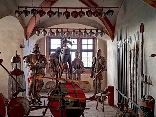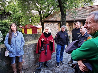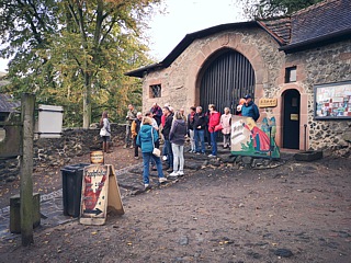 Während der Rückfahrt zum Hotel mussten wir – ebenso wie am Vormittag – keinerlei Bedenken haben, dass unsere Fahrzeuge staubig werden könnten. Es regnete nämlich immer noch. Erst am späten Nachmittag hatte Petrus ein Einsehen, so dass unsere Fahrt zur „Ronneburg“ etwas angenehmer verlief. Gegen 18:00 Uhr öffneten sich die schweren Tore der Burg für uns und während der folgenden Führung lernten wir viel über das frühere Leben auf solch einer Festung. Im Burgrestaurant wurde derweil eine lange Tafel für uns vorbereitet. Dort schlemmten wir anschließend bis in den späten Abend.