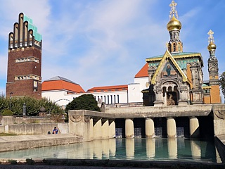Der Samstag: Die Mathildenhöhe am Rand der Darmstädter Innenstadt ist seit kurzem Weltkulturerbe. Kein Wunder also, dass dieses architektonische Kleinod von uns besucht werden musste. Als wir dort eintrafen, wartete vor dem Hochzeitsturm gerade eine Hochzeitsgesellschaft auf das Brautpaar. Der Hochzeitsturm ist ein beliebter und stark frequentierter Ort, um sich dort das Ja-Wort zu geben. Pech für uns, denn wir konnten deshalb den Turm nicht besichtigen.