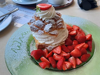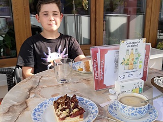 Derweil entdeckte ich mit meinem Beifahrer, Maximilian Rader, im Ortskern das Café am Markt. Dort gab es zwar keine Windbeutel, aber erstklassigen Kuchen.
