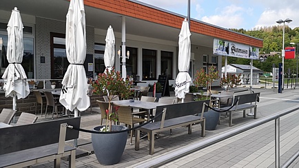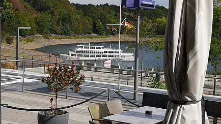 Etwa eine Stunde später erreichten wir die Seeterrassen am Biggesee bei Sondern. Aufgrund der herbstlichen Temperaturen verbrachten wir die Mittagspause drinnen. Dort wurde wahlweise mit deftigen oder süßen Speisen der Hunger bekämpft. Vor allem die Banausen von Attendorn hatten ja „schon lange nichts mehr bekommen“.
