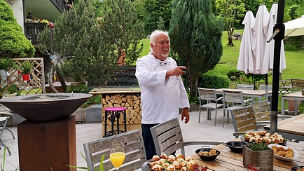 Hier hatte der Mühlen-Patron ein schnuckeliges Picknick mit netten Geschichten über die ehemaligen Schanzen in Gersbach parat. In humorvoller Weise erzählte er Dies und Das über das Gelände und den niedlichen Ort samt seiner Bewohner. Und wenn er so ins Plaudern kommt ... Nun denn, essen wir halt etwas später zu Abend.