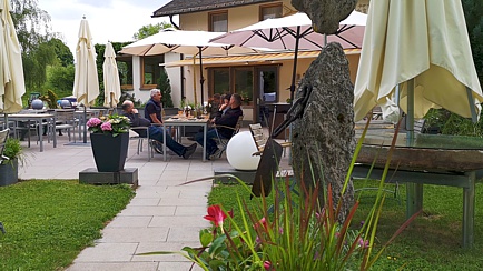 Kurz einchecken, frisch machen und ab auf die Hotelterrasse, lecker Kaffee und Kuchen genießen und weitere Ankömmlinge begrüßen.