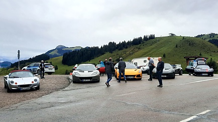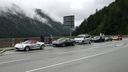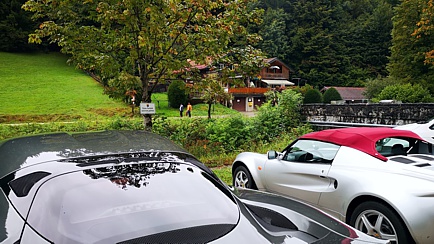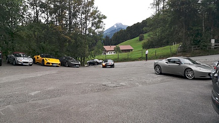 Zum Glück hatte Thomas noch zwei weitere „Pfeile im Köcher“. Fast alle entschieden sich für die zweite Option. Auch diese Route führte über schöne Bergstraßen. Anders als bei den Bayern-Events der vergangenen Jahre, musste unser Kurdirektor an diesem Wochenende keinen beruflichen Pflichten nachkommen und hatte somit die Gelegenheit, selbst mit seinem geliebten Lotus die Tour mitzufahren. Also legte er gemeinsam mit Sabine, seiner besseren Hälfte, als Sozius die Spur und der Rest folgte ihm. Die bekannte, rund 16 Kilometer lange Tatzelwurmstraße gehörte auch zu unserer Route.